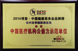 2014年12月6日,2014博鳌·第二届中国健康服务业论坛拉开帷幕。论坛期间,同时举行了“中国健康服务业公信力颁奖盛典”,徐医附院被评定为“2014·中国最具公信力医疗机构”(三级甲等医院评选序列),徐州仅一家。